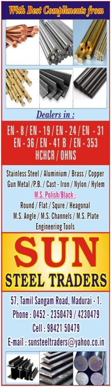 Stainless Steel 304 Grade Round : 2 mm to 150 mm Square : 6 mm to 50 mm Flat : 25mm x 3mm to 100mm x 25mm Sheet :22G, 20G, 18G, 16G, 14G, 12G, 10G, 4mm ,5mm, 6mm Hex : 12mm to 32mm Ms Angle 25 x 3 , 32 x 3, 40x 3, 50 x 3, 25 x 6, 32 x 6, 40 x 6 , 50 x 6, 65 x 6, 75 x 6, 75 x 6, 75 x 8, 100 x 10 Ms Channel 75 x 40 , 100 x 50 , 125 x 65 , 150 x 75 , 200 x 75 Ms Flat 25 x 3 to 150 x 25 mm